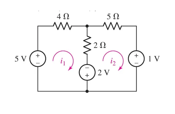 -5 + 4i_1 + 2(i_1 - i_2) - 2 = 0 \newline