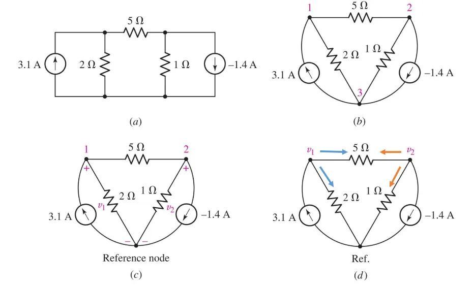 - Assign node voltages (Note, in a circuit with, $N$, nodes we have, $N - 1$, voltages)