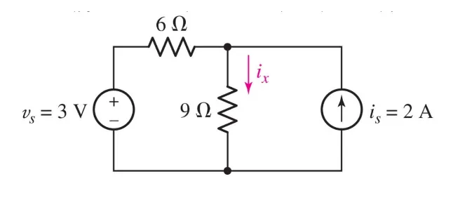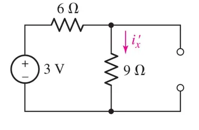 $$ V = R \cdot\ I \newline 3 V = R_{eq} \cdot\ i^{\prime}_{x} \newline i^\prime_x = \frac{3 V}{6 \Omega + 9 \Omega} = 0.2 A $$