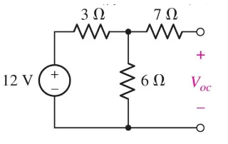 $$ V_{oc} = V_6 \quad | \quad \text{Since they are in parallel} \newline V_6 = V_{total} \cdot\ \frac{R_6}{(R_3 + R_6)} = 12 V \cdot\ \frac{6 \Omega}{3 \Omega + 6 \Omega} = 8 V \newline V_{TH} = V_{oc} = 8 V $$