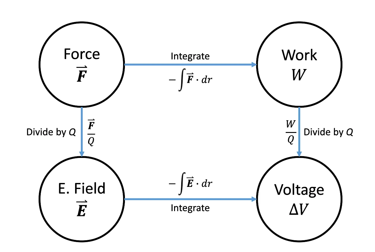 Recall from earlier that we deduced that: $$ \dfrac{W}{q} = - \int_A^B \mathbf{\vec{E}} \cdot\ d\mathbf{\vec{s}} = \Delta V $$