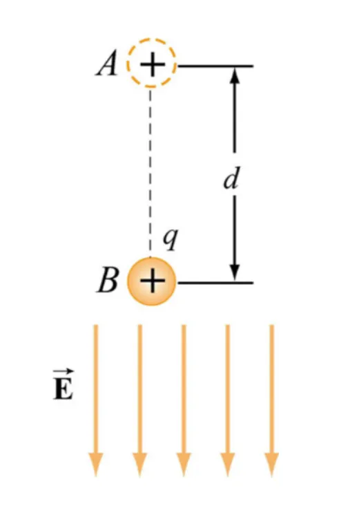 $$ \begin{align*} W & = - \int_A^B \mathbf{\vec{F}} \cdot\ d\mathbf{\vec{r}} \newline & = - \int_A^B q\mathbf{\vec{E}} \cdot\ d\mathbf{\vec{r}} \newline & = -qE_0 \int_A^B d\mathbf{\vec{r}} \newline & = -qE_0d \end{align*} $$